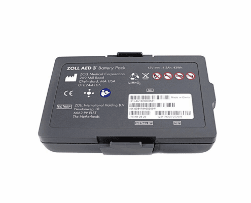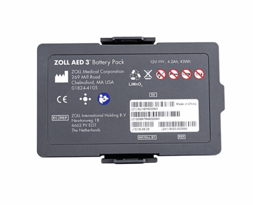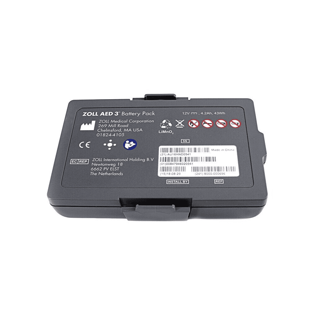 Paquete de baterías del ZOLL AED 3 (batería de dióxido de manganeso de litio para ZOLL AED 3 utiliza una batería inteligente que puede informar del estado de su nivel de energía en la pantalla LCD del dispositivo o transmitirlo automáticamente a través de WiFi a la gestión de su programa AED. En modo de espera, la batería desechable de dióxido de manganeso y litio del ZOLL AED 3 tiene una vida útil instalada de hasta cinco años)