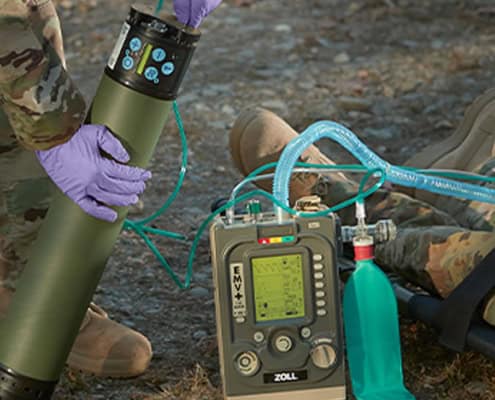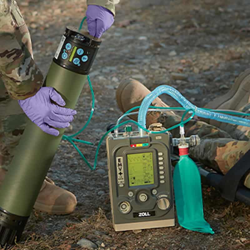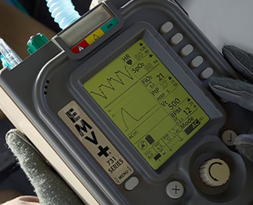 Diseñado para cumplir con las normas de transporte civil y militar, el versátil respirador portátil EMV+® es ideal para el traslado médico aéreo y en ambulancia de bebés (≥5 kg), niños y adultos. Con un peso de solo 4,4 kg (9,7 libras), el EMV+ es liviano pero resistente y cuenta con un sistema integrado de oxígeno y compresor de alto flujo, que es eficiente en términos de energía. El sistema de alimentación desde varias fuentes y el inigualable tiempo de funcionamiento de 10 horas de la batería permiten usarlo y cargarlo rápidamente usando cualquier fuente de alimentación de vehículos terrestres y aeronaves.