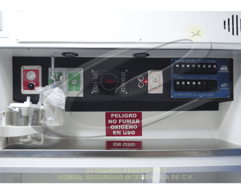 En camioneta Chevrolet el compartimiento para el tanque de oxígeno tipo M, colocado en forma vertical, fabricado en PVC Rígido modificado, o en aluminio, colocado en la parte trasera del asiento del copiloto.