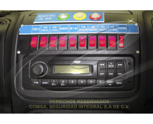 Consola de control en cabina del chofer fabricada en aluminio en la parte central del tablero del vehículo.